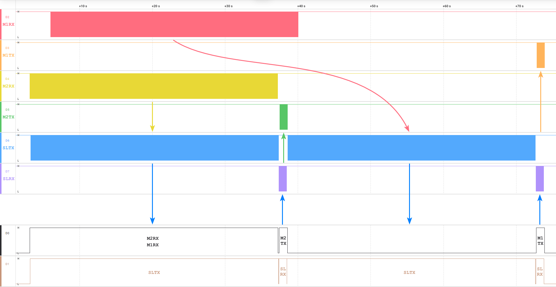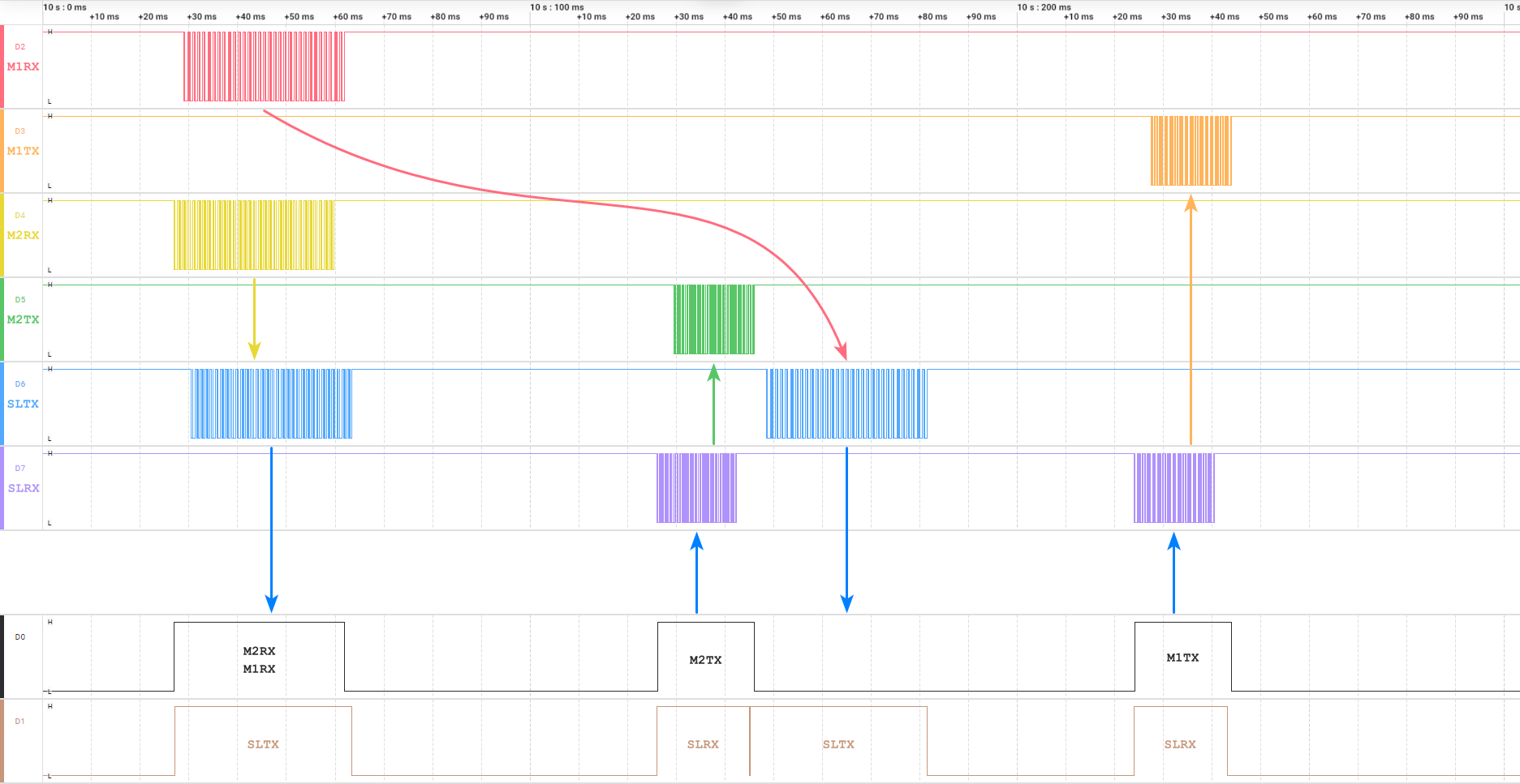 原因分析: 当 M1 向主机应答时,此时 M1 处于 Tx 状态,而 M2 仍处于 Rx 状态,所以 M2 又会收到来自 M1 的应答,这样的话从端会依次转发来自 M2 的两个请求,在转发第二个本不应该存在的请求时,第一个请求的应答可能已经来了,这样就存在相撞的风险。