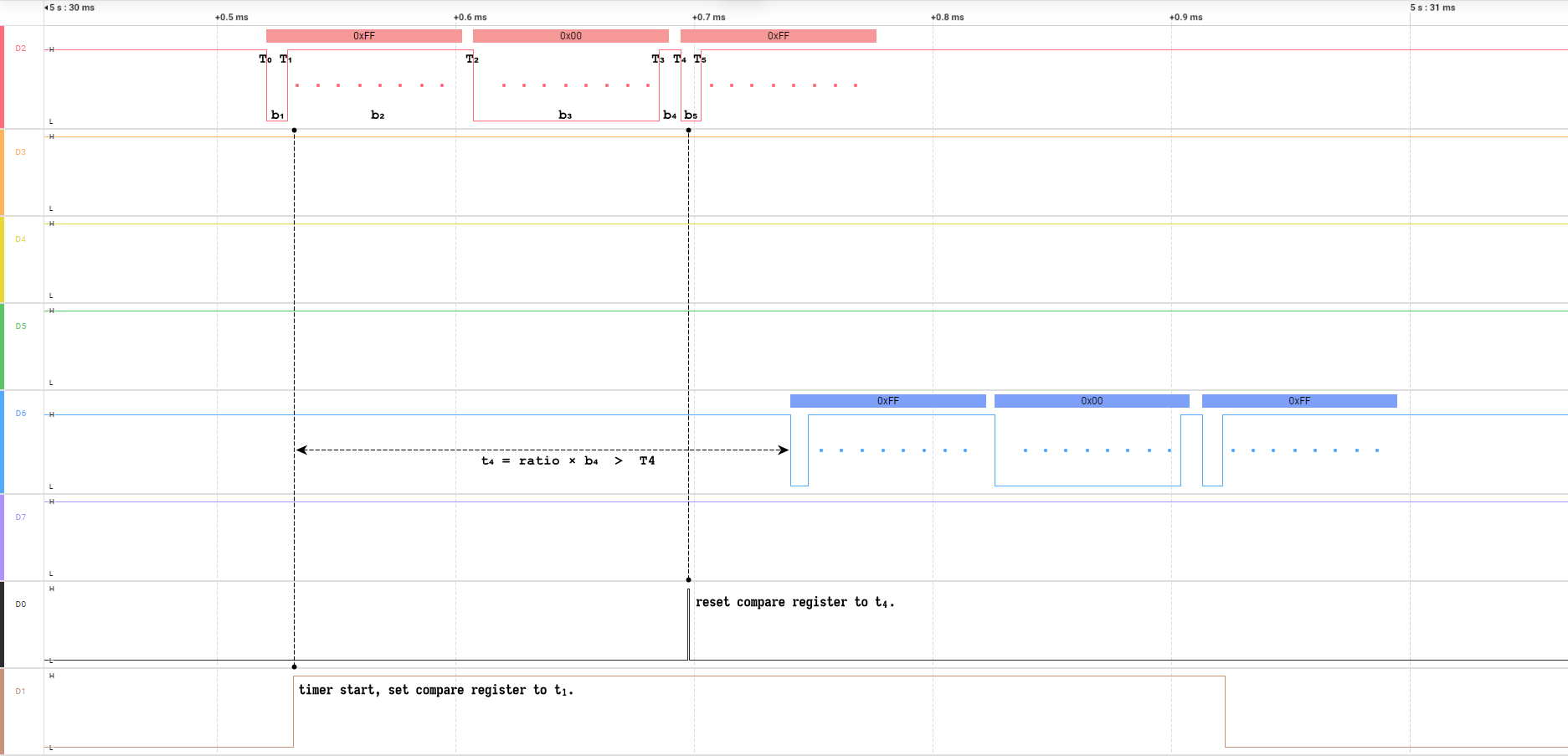 为什么不单纯使用延后若干个边沿个数的方式来控制呢?因为为了让单个的 0x00/0xFF 字节也能被正常透传,延后的边沿个数就不能超过两个,这样延后的时间太短,会出现比较中断已被触发,而新的边沿迟迟未到的情况,进而导致时序异常。